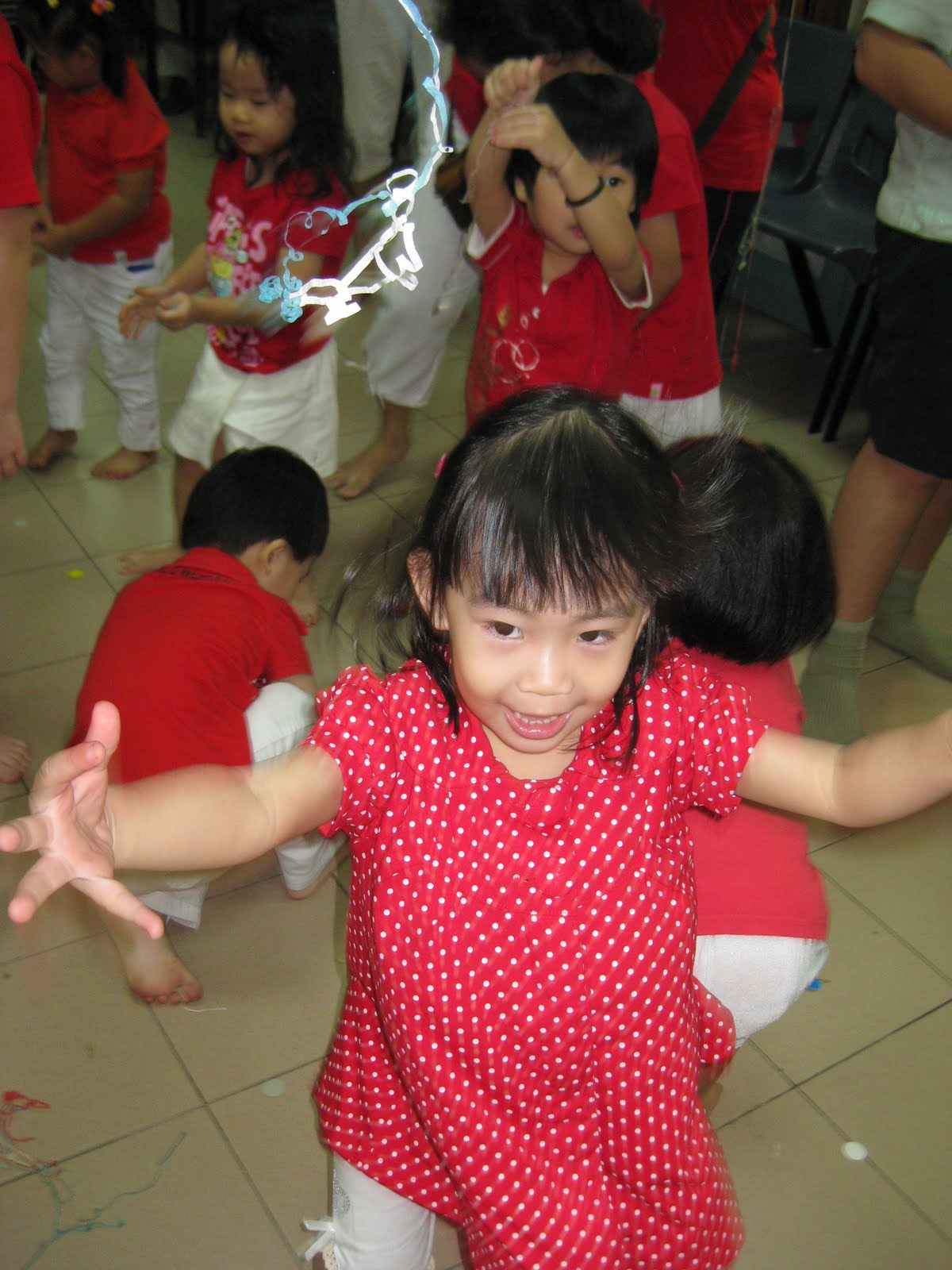 The flag was Jolie's art project for this year's National Day. I must say, after helping out in this party, my throat was all dry as I had to raise my voice over all the kids so that they can hear me. I asked the teacher how does she do it everyday? She replied, "with many many years of practice!" Hats off to you!